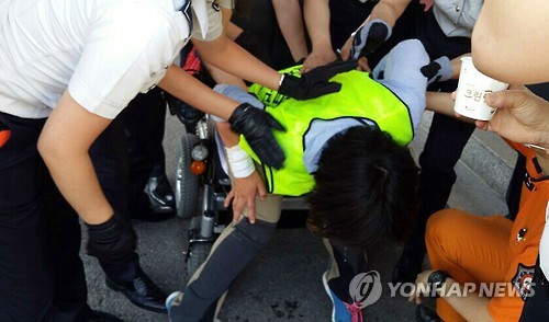 | △ 여성 장애인 강제 퇴거 (의정부=연합뉴스) 권숙희 기자 = 4일 경기 의정부시청사에서 '의정부 420 장애인 차별 철폐 공동투쟁단' 소속 한 여성 장애인이 경찰에 의해 강제로 퇴거조치 당하고 있다. 2015.6.4 suki@yna.co.kr |