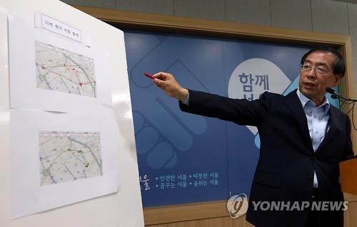 | △ 서울시장, 메르스 관련 긴급 브리핑 (서울=연합뉴스) 신준희 기자 = 박원순 서울시장이 4일 오후 시청 브리핑룸에서 메르스 관련 긴급 브리핑을 하고 있다. 박 시장은 "메르스 확진 환자인 서울의 한 의사가 격리 통보에도 불구하고 1천400명 규모의 행사에 참석했다"고 밝혔다. 왼쪽 지도는 해당 환자의 이동 동선. |