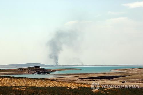| △ 수니파 무장조직 '이슬람국가'(IS)가 이라크 라마디 인근 댐의 수문을 차단해 유프라테스강 유량이 줄어들면서 하류에 있는 정부군 측 지역의 물 부족이 현실화하고 있다. 사진은 지난해 8월 미군과 이라크군의 탈환작전 과정에서 미군의 공습으로 연기가 치솟고 있는 모술댐 모습. 2015.6.5 (AP=연합뉴스DB) |