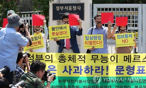 | △ (서울=연합뉴스) 전수영 기자 = 안전사회시민연대 등 17개 시민사회단체 대표들이 4일 오후 서울 세종로 정부서울청사 앞에서 메르스 사태에 대한 정부의 안일한 대처와 무능을 규탄하고 감염병원 및 경로 등 관련정보의 투명한 공개를 촉구하는 퍼포먼스를 하고 있다. 2015.6.4 swimer@yna.co.kr |