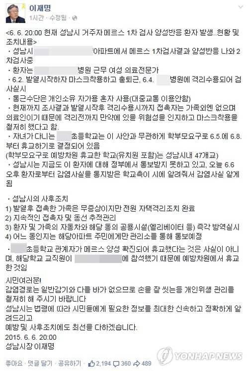 이 시장은 이날 오후 8시 10분께 자신의 페이스북에 메르스 사태와 관련한 성남시 조치 내용을 알리는 '<6.6 20:00 현재 성남시 거주자 메르스 1차 검사 양성반응 환자 발생..현황 및 조치내용>'이라는 글을 올렸다.