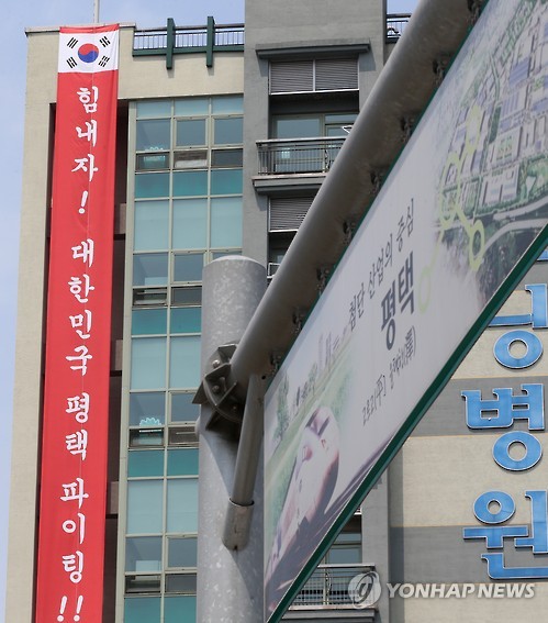 | △ 메르스 환자 경유한 병원에 걸린 '힘내자' 현수막 (평택=연합뉴스) 신영근 기자 = 정부가 중동호흡기증후군(메르스) 확진환자가 발생했거나 경유한 병원을 공개한 7일 오전 경유 병원으로 명단에 오른 경기도 평택의 한 병원 건물에 '힘내자! 대한민국 평택 파이팅!!'이란 현수막이 걸려 있다. 병원 관계자는 메르스로 어려움을 겪고 있는 평택 시민들을 위해 현수막을 걸었다고 밝혔다. 2015.6.7 drops@yna.co.kr http://blog.yonhapnews.co.kr/geenang |