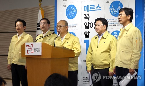 | △ 메르스 대응 정부-지자체 합의사항 발표 (세종=연합뉴스) 배재만 기자 = 문형표 보건복지부 장관이 7일 오후 정부세종청사 보건복지부 공용브리핑룸에서 '중앙 정부와 지자체 간 메르스 총력 대응을 위한 협력 합의사항'을 발표하고 있다. 왼쪽부터 안희정 충남도지사, 박원순 서울시장, 문 장관, 권선택 대전시장, 남경필 경기도지사. 2015.6.7 scoop@yna.co.kr http://blog.yonhapnews.co.kr/f6464 |