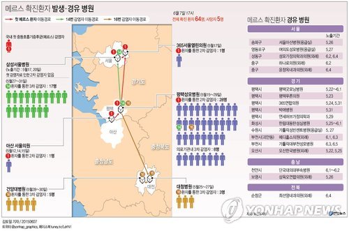| △ <그래픽> 메르스 확진환자 발생·경유 병원(종합) (서울=연합뉴스) 김토일 기자 = 정부가 7일 공개한 중동호흡기증후군(메르스) 관련 병원은 서울, 경기, 충남, 대전, 전북 등 모두 5개 시·도 24개 의료기관이다. 공개된 병원 가운데 메르스 환자가 직접 발생한 곳은 4개 시·도 6개 의료기관이고, 나머지 4개 시·도 18개 의료기관은 메르스 환자가 증상 발현 이후 확진 판정을 받기 전에 다녀간 병원들이다. kmtoil@yna.co.kr 페이스북 tuney.kr/LeYN1 트위터 @yonhap_graphics |