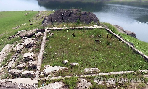 | △ 가뭄으로 드러난 대청호 수몰학교 (옥천=연합뉴스) 박병기 기자 = 중부권에 확산하는 가뭄으로 대청호 수위가 내려앉으면서 댐 건설로 물에 잠겼던 충북 옥천군 군북면의 옛 군북초등학교가 앙상한 뼈대를 드러냈다. 8일 대청호 수위는 67.18m(만수위는 80m), 저수율은 44%에 머물고 있다. 2015.6.8 bgipark@yna.co.kr |