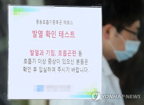 | △ "발열 증세 있으면 메르스 의심하세요" (부천=연합뉴스) 윤태현 기자 = 중동호흡기증후군(메르스)이 수도권을 중심으로 확산하는 가운데 7일 오후 경기도 부천시의 한 대형병원 응급실에 발열 확인을 권고하는 안내장이 붙어 있다. 앞서 경기도 부천시는 지난 6일 메르스 접촉자로 관리되지 않던 주민 A(36)씨가 경기도 보건환경연구원 검사를 통해 1차 양성 판정을 받았다고 밝혔다. A씨는 이 병원에 격리돼 치료받는 것으로 전해졌다. 2015.6.7 tomatoyoon@yna.co.kr |