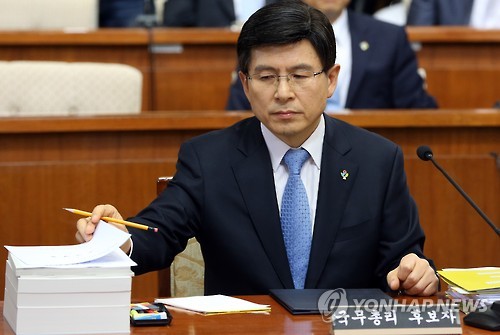| △ 자료 살피는 황교안 총리 후보자 (서울=연합뉴스) 홍해인 기자 = 황교안 국무총리 후보자가 8일 오전 서울 여의도 국회에서 열린 국무총리 후보자 인사청문회에 출석해 청문회 시작을 기다리며 자료를 살피고 있다. 이날과 9일은 황 후보자를 상대로 질의하고 10일에는 황 후보자가 배석하지 않는 가운데 증인·참고인 심문을 진행한다. |