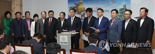 | △ 익산시의회 "익산국토청 분리 방안 재검토하라" (익산=연합뉴스) 전북 익산시의회 의원들이 8일 시의회 청사에서 호소문을 내고 "행정자치부는 익산지방국토관리청을 전북청과 전남청으로 분리·재배치하려는 계획을 전면 중단하고 재검토하라"고 촉구하고 있다. 2015.6.8 << 익산시의회 >> sollenso@yna.co.kr |