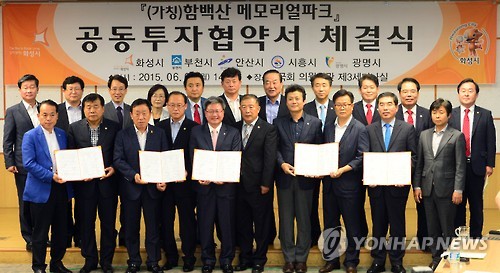 (화성=연합뉴스) 김인유 기자 = 경기도 화성·안산·부천·시흥·광명시가 광역화장장(가칭 '함백산 메모리얼파크') 건립비용을 공동으로 부담하기로 하고 8일 오후 국회 의원회관에서 공동투자협약을 체결했다.