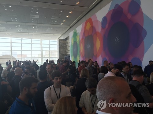 | △ 북적이는 세계개발자회의 (샌프란시스코=연합뉴스) 임화섭 특파원 = 8일(현지시간) 전세계 시가총액 제1위 기업인 애플의 세계개발자회의(WWDC) 2015 행사장 3층 입구에서 기조연설을 듣기 위해 참석자들이 입장을 기다리고 있다. 2015.6.9. solatido@yna.co.kr |