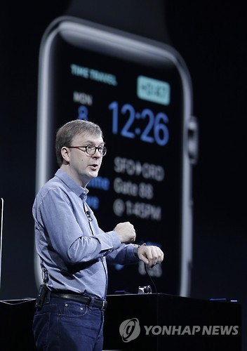 | △ 애플의 기술담당 부사장 케빈 린치가 8일(현지시간) 샌프란시스코에서 개막한 세계개발자회의(WWDC) 2015에서 워치OS 2를 시연하고 있다. (샌프란시스코 AP=연합뉴스) (AP Photo/Jeff Chiu) |