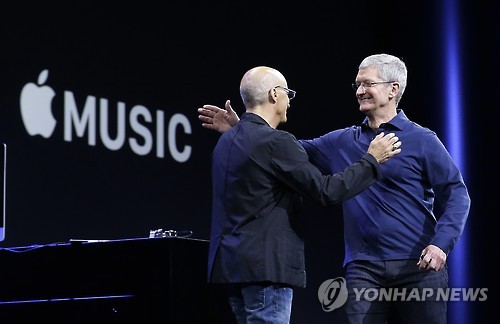 (샌프란시스코=연합뉴스) 임화섭 특파원 = 전 세계 시가총액 제1위 기업 애플이 유료 스트리밍 음악서비스 '애플 뮤직'을 내놓기로 했다. 서비스 개시일은 6월 30일이며 세계 100여개국에서 출시된다.