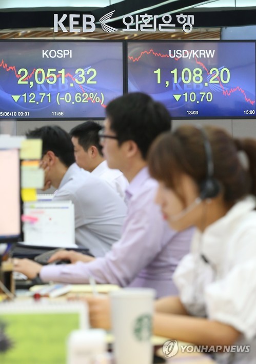 | △ 코스피ㆍ코스닥 동반 하락 (서울=연합뉴스) 김주성 기자 = 10일 서울 중구 을지로 외환은행 본점에서 딜러들이 거래업무를 보고 있다. 이날 원/달러 환율은 전날에 이어 약세를 지속했으며, 코스피와 코스닥은 외국인과 기관의 매도세에 밀려 동반 하락했다. 2015.6.10 utzza@yna.co.kr |