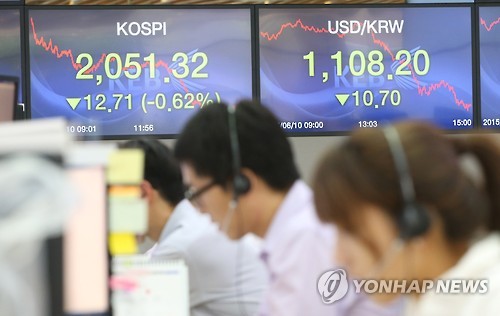 | △ 코스피ㆍ코스닥 동반 하락 (서울=연합뉴스) 김주성 기자 = 10일 서울 중구 을지로 외환은행 본점에서 딜러들이 거래업무를 보고 있다. 이날 원/달러 환율은 전날에 이어 약세를 지속했으며, 코스피와 코스닥은 외국인과 기관의 매도세에 밀려 동반 하락했다. |