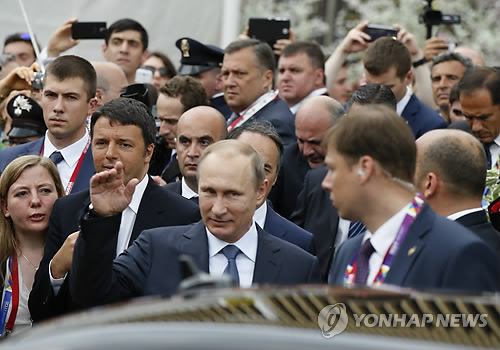 | △ 푸틴, 밀라노 엑스포 방문 (밀라노 AP=연합뉴스) 10일(현지시간) 이탈리아를 방문한 블라디미르 푸틴(가운데) 러시아 대통령이 밀라노 부근 료의 밀라노 엑스포(국제박람회) 러시아관에 들르고 나와 손을 흔들고 있다. 그의 바로 뒤 왼쪽은 마테오 렌치 이탈리아 총리. bulls@yna.co.kr |