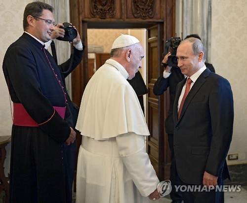 | △ (EPA=연합뉴스) 프란치스코 교황은 10일(현지시간) 블라디미르 푸틴 러시아 대통령에게 우크라이나에 평화를 가져올 수 있도록 진실하고 적극적인 노력을 해줄 것을 촉구했다. EPA/ALEXEY NIKOLSKY / RIA NOVOSTI / KREMLIN POOL MANDATORY CREDIT |