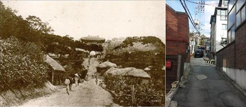 | △ 1910년께 창의문 옛길의 모습(왼쪽)과 현재 창의문로10길 모습<<서울 종로구 제공>> |