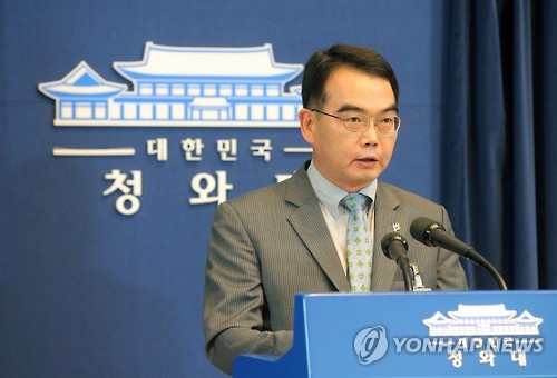 | △ 대통령 방미 일정 연기 발표하는 김성우 홍보수석 (서울=연합뉴스) 이정훈 기자 = 김성우 홍보수석이 10일 오전 청와대 춘추관에서 박근혜 대통령의 미국 방문 일정 연기 결정을 발표하고 있다. 2015.6.10 uwg806@yna.co.kr |
