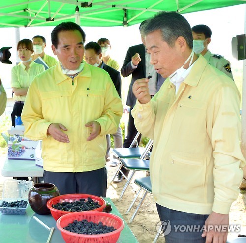 | △ 행자부장관 "메르스 격리 마을 농산물 안전해요" (순창=연합뉴스) 정종섭 행정자치부 장관이 9일 중동호흡기증후군(메르스) 감염 환자가 발생해 마을이 통째로 격리된 전북 순창군을 찾아 블루베리와 오디 등 지역에서 생산된 농산물을 맛보고 있다. 정 장관은 메르스 환자 발생 이후 지역 농산물이 외면받고 있다는 말을 듣고 시식행사를 마련했다. 2015.6.9 <<순창군>> doin100@yna.co.kr |