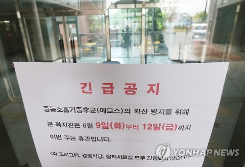 | △ 메르스 우려에 휴관한 노인복지관 (부산=연합뉴스) 차근호 기자 = 11일 오후 부산시 사하구의 한 노인복지관이 중동호흡기증후군(메르스)에 대한 우려로 휴관에 들어가 썰렁한 모습을 보이고 있다. 2015.6.11 ready@yna.co.kr |