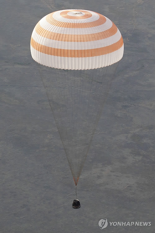 | △ 지구로 돌아오는 우주인들 (제즈카즈간<카자흐스탄> AP=연합뉴스) 국제우주정거장(ISS) 체류 임무를 마친 미국의 테리 버츠와 러시아의 안톤 슈카플레로프, 이탈리아의 사만사 크리스토포레티 등 우주인 3명이 탄 소유스 TMA-15M 우주선 캡슐이 11일(현지시간) 카자흐스탄 제즈카즈간 인근 초원지대에 착륙하고 있다. |