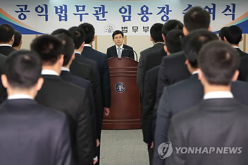 | △ 황교안 법무부 장관이 정부과천청사 법무부에서 열린 '2015년 상반기 공익법무관 임용장 수여식'에서 인사말을 하고 있다.(연합뉴스 사진DB) |