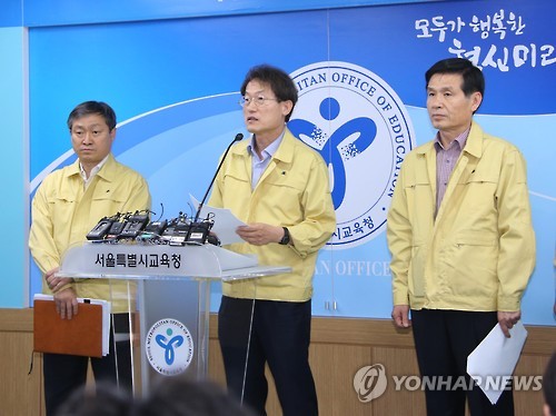 | △ 조희연 교육감, 제5차 메르스 확산 방지 긴급 대책회의 결과 발표 (서울=연합뉴스) 조희연 서울시교육감이 12일 오후 서울 종로구 서울시교육청 브리핑룸에서 제5차 중동호흡기증후군(MERS·메르스) 확산 방지 긴급 대책회의 결과를 발표하고 있다. 서울시 교육청은 강남구와 서초구의 유치원·초등학교 휴업 지속 여부에 대한 결정을 학교의 자율판단으로 전환하기로 했다. (서울시교육청 제공) |