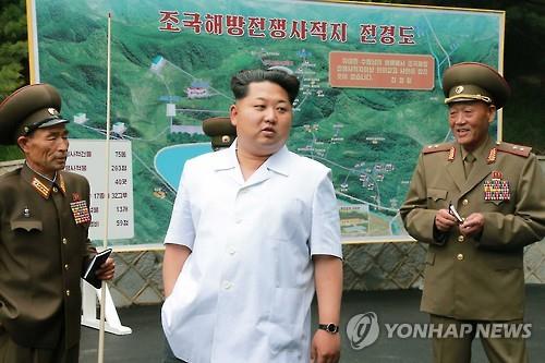 | △ (서울=연합뉴스) 김정은 북한 국방위원회 제1위원장이 최근 한국전쟁 조국해방전쟁 사적지를 시찰, 사적지 전경도를 둘러보면서 수행원들과 얘기하는 모습. 이 사진은 북한 노동당 기관지 노동신문 9일자 1면에 실렸다. 2015.6.11 |