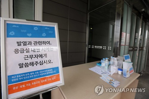 | △ (부산=연합뉴스) 조정호 기자 = 부산에서 확인된 중동호흡기증후군(메르스) 확진자 이모(31)씨가 입원치료를 받은 부산 좋은강안병원 응급실 입구에 13일 발열 환자와 관련한 안내문이 붙었다. 2015.6.13 ccho@yna.co.kr |
