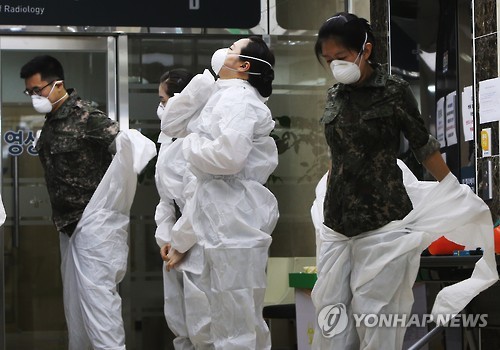 | △ 방역복 입는 군 의료 지원단 (대전=연합뉴스) 이재림 기자 = 12일 대전 서구 대청병원에서 군의관과 간호장교가 방역복을 입고 있다. 국방부는 대전시의 요청으로 중동호흡기증후군(메르스) 환자가 발생한 대청병원에서 진료 활동을 펼칠 의료 인력을 파견했다. 2015.6.12 walden@yna.co.kr |