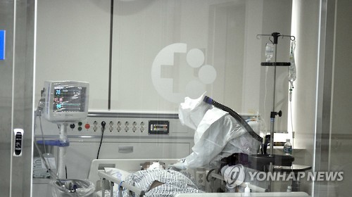 | △ (부산=연합뉴스) 중동호흡기증후군(메르스)에 감염된 부산의 두 번째 환자 이모(31)씨에 대해 질병관리본부가 최종 확진 판정을 내렸다. 최첨단 음압시설을 갖춘 동아대병원 격리병실에서 의료진이 143번째 감염자인 이씨를 치료하고 있다. 2015.6.14 << 동아대병원 제공 >> ccho@yna.co.kr |