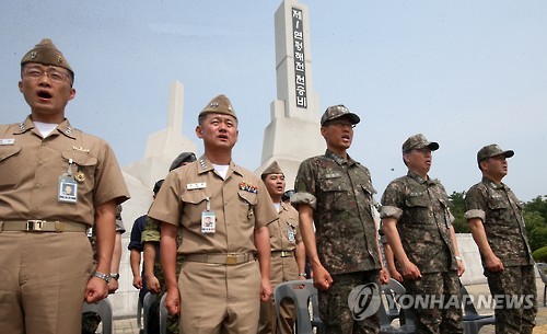 | △ 제1연평해전 승전 16주년 기념행사 (평택=연합뉴스) 신영근 기자 = 15일 오전 경기도 평택 해군 제2함대사령부에서 제1연평해전 승전 16주년 기념식이 열려 참석 장병들이 해군가를 부르며 서해 북방한계선(NLL) 수호의지를 다지고 있다. 제1연평해전은 1999년 6월 15일 NLL을 침범한 북한 경비정의 기습사격으로 발발했으며 14분간의 교전 결과 북한군은 함정 1척 침몰, 5척 대파, 4척 중파 등 큰 피해를 보았지만 우리 해군은 함정 2척이 경미한 손상을 입는 데 그치며 압도적 승리를 거둔 해전이다. 2016.6.15 drops@yna.co.kr http://blog.yonhapnews.co.kr/geenang |