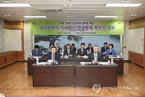 | △ 재정 위협하는 '시내버스 준공영제' 손질 (대구=연합뉴스) 14일 대구시청 2층 상황실에서 시내버스 준공영제 개혁시민위원회가 지난 4개월 동안 마련한 '버스 준공영제 혁신안'을 발표하고 있다. 2015.5.14 <<대구시 제공>> suho@yna.co.kr |
