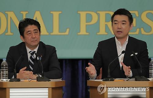 | △ 참의원 선거를 앞두고 2013년 7월 3일 일본기자클럽에서 열린 토론회에서 아베 신조(왼쪽) 총리의 곁에 앉은 하시모토 도루 오사카 시장이 발언하고 있다.(AP=연합뉴스 자료사진) |