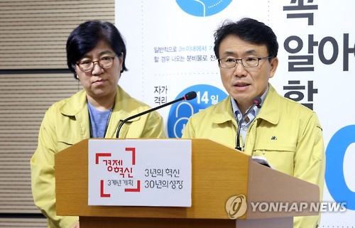 | △ 권덕철 총괄반장, '메르스는' (세종=연합뉴스) 배재만 기자 = 권덕철 중앙메르스관리대책본부 총괄반장이 15일 오전 정부세종청사 보건복지부 공용브리핑룸에서 열린 중동호흡기증후군(메르스) 정례 브리핑에서 기자들의 질문에 답하고 있다. 왼쪽은 정은경 현장점검반장. 2015.6.15 scoop@yna.co.kr http://blog.yonhapnews.co.kr/f6464 |