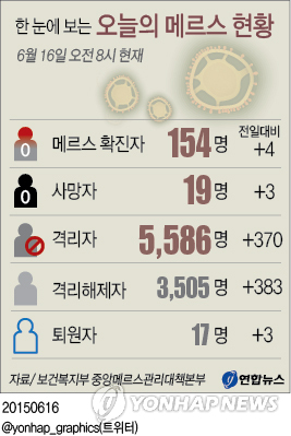 보건복지부 중앙메르스관리대책본부는 메르스 검사에서 4명이 추가로 확진 판정을 받아 국내 감염자수가 154명으로 늘었다고 16일 밝혔다.
