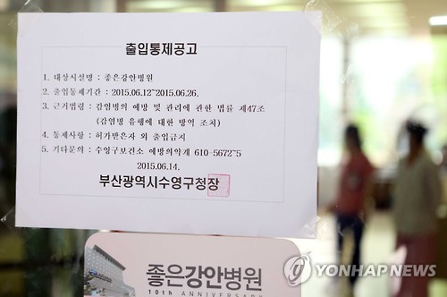 | △ "감염병 예방 출입통제합니다" (부산=연합뉴스) 조정호 기자 = 부산시는 중동호흡기증후군(메르스)에 감염된 143번 환자가 입원했던 부산 좋은강안병원의 2개 층을 외부와 차단하는 '코호트 격리'했다. 수영구청에서 감염병 예방을 위해 병원 출입을 통제한다는 내용의 공고문이 출입문에 붙었다. |