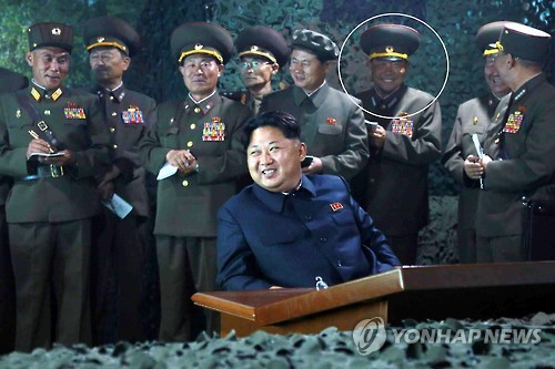 | △ 야간군사연습 참관하는 김정은 (서울=연합뉴스) 김정은 북한 국방위원회 제1위원장이 제10군단 산하 지상포병 구분대와 해군 동해함대 전투함선이 참여한 야간 해상화력타격연습을 참관했다고 노동신문이 16일 보도했다. 북한이 '정부 성명'을 통해 남한과의 대화 가능 의지를 밝힌 다음날 군사연습 소식을 공개한 것이다. 사진은 간부들에게 둘러싸여 군사연습을 참관 중인 김정은 제1위원장. 숙청된 현영철 후임으로 인민무력부장에 올랐을 가능성이 유력한 박영식(흰색 원) 인민군 대장도 김 제1위원장의 오른쪽 뒤편에서 웃고 있다. 2015.6.16 nkphoto@yna.co.kr |