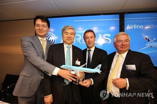 | △ (서울=연합뉴스) 조원태 한진칼 대표이사는 16일(현지시간) 파리 에어쇼가 열리는 프랑스 르부르제 공항에서 에어버스, 보잉으로부터 항공기 100대를 신규 도입하는 항공기 구매 양해각서를 체결했다. 조원태 한진칼 대표이사(왼쪽부터)와 조양호 한진그룹 회장, 파브리스 브레지에 에어버스 최고경영자가 양해각서 체결 후 포즈를 취하고 있다. 2015.6.16 << 대한항공 제공 >> |