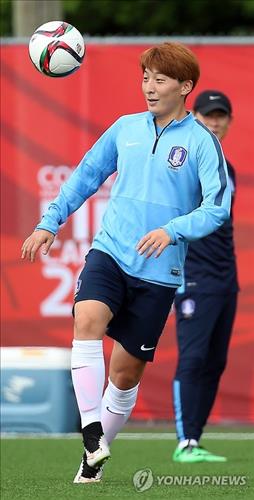 | △ (오타와=연합뉴스) 신준희 기자 = 16일 오전(한국시간) 캐나다 오타와 알곤퀸 대학교 훈련장에서 여자축구 대표팀 박은선이 훈련을 하고 있다. 오른쪽은 윤덕여 감독. 대표팀은 오는 18일 스페인과의 2015 캐나다 여자 월드컵 조별리그 마지막 경기를 치른다. 2015.6.16 hama@yna.co.kr |