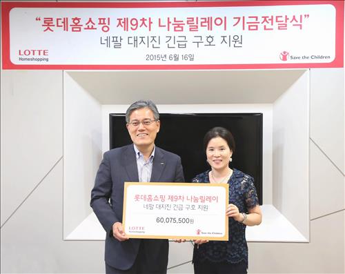 강현구 롯데홈쇼핑 대표이사는 16일 서울 마포구 세이브더칠드런 본관에서 열린 기부금 전달식에서 김미셸 세이브더칠드런 사무총장에게 네팔 대지진 긴급 구호기금으로 사용해달라고 당부했다.