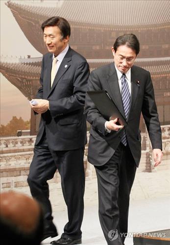| △ 제7차 한중일 외교장관회의를 마친 윤병세 외교부 장관(왼쪽), 기시다 후미오 일본 외무상이 2015년 3월 21일 서울 중구 신라호텔에서 공동기자회견을 마친 뒤 기자회견장을 나서고 있다.(사진공동취재단 = 연합뉴스 자료사진) |