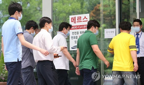 | △ "삼성서울병원 전 직원 매일 발열감시" (서울=연합뉴스) 임헌정 기자 = 17일 중동호흡기증후군(메르스) 확산 여파로 부분적인 병원 폐쇄조치가 내려진 서울 일원동 삼성서울병원에서 보안요원이 일반인의 출입을 통제하는 가운데 직원들이 마스크를 쓰고 병원으로 들어가고 있다. 2015.6.17 kane@yna.co.kr |