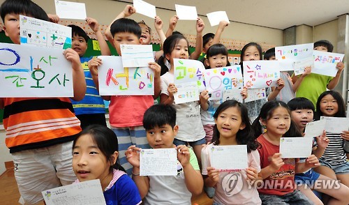 18일 경기도 양평군 양서면 양서초등학교의 한 교실에서 이 학교 학생들이 고사리손으로 눌러쓴 알록달록한 편지를 들어 보이며 쑥스러운 듯 웃었다.