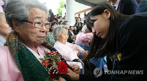 | △ 지난 5월, 가정의 달을 맞아 광주 나눔의 집을 방문한 한 학생이 유희남 할머니(왼쪽)의 가슴에 카네이션을 달아주고 있다. (연합뉴스 자료사진) |