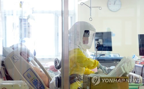 | △ '메르스 환자, 최선을 다해 치료하겠습니다' (서울=연합뉴스) 윤동진 기자 = 19일 오전 메르스 환자가 격리 치료 중인 서울 중구 국립중앙의료원에서 방호복을 입은 병원 관계자가 업무를 보고 있다. 2015.6.19 mon@yna.co.kr |