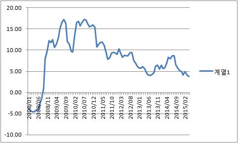 이 증가율은 2008년 10월 8.0%로 높아지고서 서서히 상승해 2009년 8월과 2010년 7월에 각각 17.3%에 달하는 등 한국 경제가 금융위기의 충격을 벗어나고서 2009년부터 2011년 상반기까지 두자릿수 증가율을 대체로 유지했다.