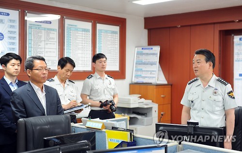 | △ 메르스 첫 경찰관 확진자와 접촉해 격리됐던 경찰관 13명이 모두 업무에 복귀했다. 사진은 지난 10일 강신명 경찰청장이 평택경찰서를 방문해 메르스 관련 사항을 점검하는 모습. (연합뉴스 자료사진) |