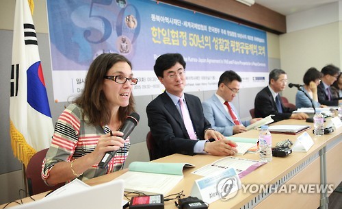 | △ 한일협정 50년사 국제학술회의 (서울=연합뉴스) 서명곤 기자 = 22일 서울 서대문구 동북아역사재단에서 열린 '한일협정 50년사 재조명' 국제학술회의에서 알렉시스 더든 미국 코네티컷대 교수가 주제발표를 하고 있다. 2015.6.22 seephoto@yna.co.kr |