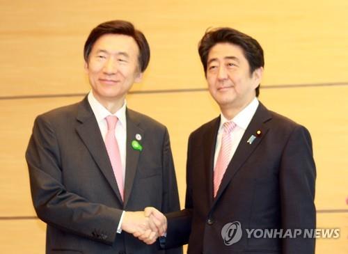 | △ 악수하는 윤병세(왼쪽) 한국 외교부 장관과 아베 신조 일본 총리. |